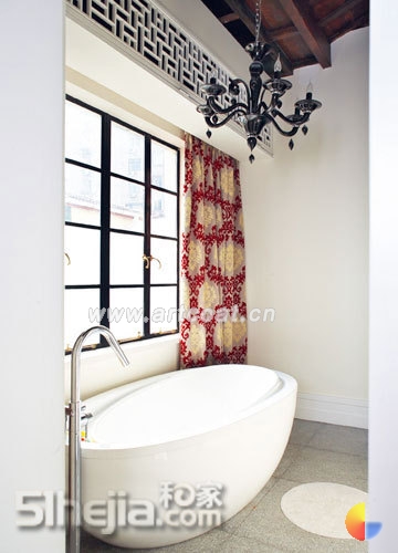 浴室是三楼主人房最有特点的地方,白色的主调让空间显得纯洁干净,厚重的窗帘带着华丽的花纹为其带来浓墨重彩的一笔。