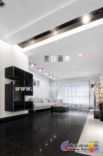 经典的黑白色在完美的灯光映衬下将优雅的姿态表露无遗,深灰近乎黑色的地砖、白色的墙面,米色的沙发配合在一起,过滤掉了其他不相干的色彩,愈发衬托出空间卓尔不凡的高雅气质。