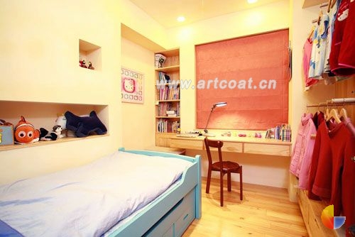小孩房简单乾净。平时希望小孩能保持床舖整齐的习惯,因此将床旁边的壁面挖空,让睡眠时依赖玩偶入睡的小孩,能有摆放心爱的玩具的空间。呈列式的开放衣柜,让小女孩一件件可爱多彩的衣服活泼了这个独立又可作梦的小小世界。