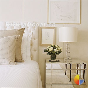 在纯色背景墙上,用贴花墙纸按照顺时针方向分别贴在墙壁和床头板上。粘贴墙纸时,手要又轻又稳。最简单的办法是,当你想好粘贴的位置后,一边慢慢地撕下背面的贴膜,一边将贴纸附在墙面上,然后用卡片将它刮平。