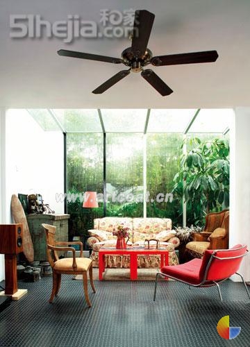 一楼最鲜丽的区域是玻璃暖房。八面呈“L”形的落地玻璃窗前,一边是柔软的碎花布艺沙发,一边是东南亚风情的彩色床榻;窗外青翠的竹子和芭蕉如一面屏风,与室内的绿色植物浑然一体。白天,阳光在室内洒下光影点点;夜里,举头便是繁星密布,在这“窝”着,无论是读书、听音乐,抑或什么都不想什么都不做,都宛若置身于山林,宁静而祥和。暖房的正前方就是花园。花、草、木、竹环绕着整幢别墅,屋前的一角有个不大的鱼池,屋后的一大块空地则是金毛犬和洛威犬的家。