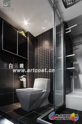 半亚光的黑色地脉石墙砖与高档的洁具一起构成了经典的黑白风格卫浴设计,独具匠心的在小空间里设计了台阶,配合地面灯光,形成了明亮的分隔带,具有很强的层次感。