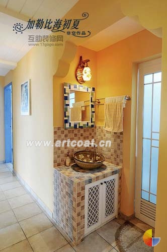 居室呈现出抽象的阳光-海--沙滩。粗犷的蓝条纹沙发,和橙黄色墙面,强烈的视觉撞击,热情奔放。各处很海洋文化的角落,衬托出设计师的别具匠心。