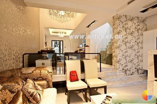这套作品,是现代与美式风格的完美结合,合谐就是精致。看,墙纸花案与沙发图案和装饰干花,无论是在颜色还是花型,都搭配合谐完美,不难看出设计师的精心设计。