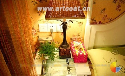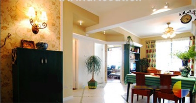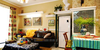 客厅中设计了几段眉檐,它们并没有连绵不断,而是错落有致的断开,制造了一种残垣断壁的意境。沙发旁的冰箱上方设计成凉亭状,恰似户外花园的景致。墨绿色的 家具 ,有点复古,有点张扬,又有点刁巧,仿佛让人感觉回到了原野上。客厅的吊扇灯,复古的精致雕花,展现优雅、细腻的风情。