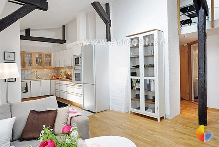 客厅厨房在同一个区域,白色的墙面上的黑色横梁,不同寻常