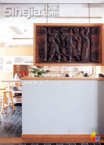 厨房开放式窗口重镶了边框的“刘、关、张”木雕,是客人入门后的第一个惊喜看点。