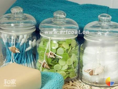 海洋主题浴室的灵感自然来源于白色的沙滩和蓝蓝的海水以及阳光的海岸。想要完美的打造这一切可不容易,每个细小的配饰都要经过精心挑选。可以买些贝壳和沙子来营造海岸风情,海蓝色的毛巾,让大海仿佛浮现在眼前。