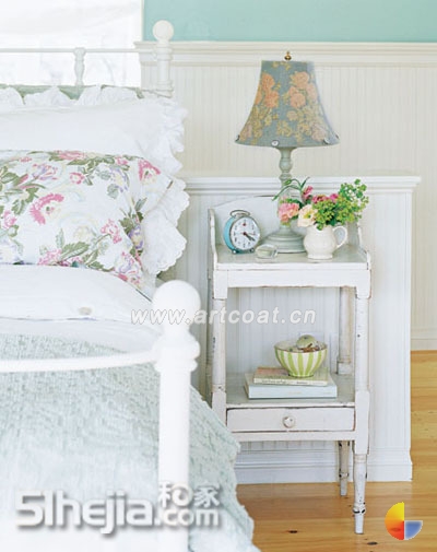 田园风情少不了甜美气息,印花的枕头、镂空的床罩、枕套边的孔眼花边以及灯罩上的纽扣装饰都是使卧室变得甜美的细节装饰。