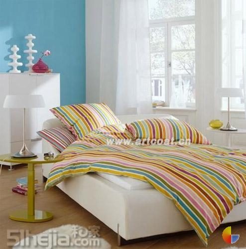 卧室作为整个居室的一部分,需要遵循居室的整体风格,像这样,白色为基调,搭配上漂亮的彩虹色条纹,很抢眼。