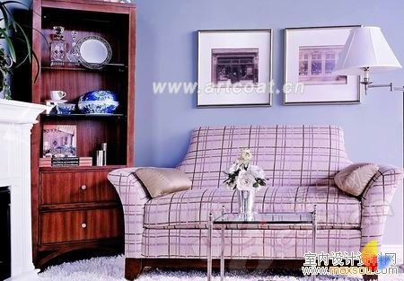 灰蓝墙面打底的基调上,欧式白色装饰壁炉是古典家居的标准配置。多层扶手的土色格纹沙发突出都市人青睐的舒适和简洁,金属框架双层玻璃的可移动式小几方便码放杂志和零食,在视觉上也通透无比。角柜的设计半中半西,摆放的西洋酒具和青瓷盛器也糅合了两种风格。