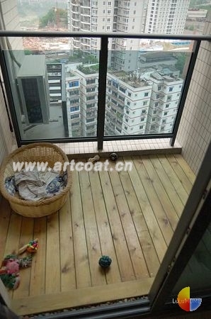 阳台的图。丁点小,老公非要做防腐木,现在他也挺后悔的,因为如果贴瓷砖,几乎就不要另外加钱,因为我们本来就多了大概那么大面积的通体砖(就是