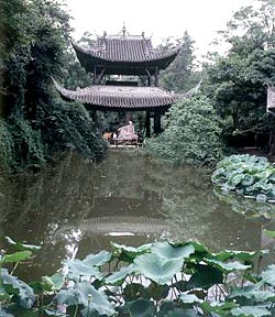 三苏祠总建筑面积有11500平方米,主要建筑有正门、前厅、公殿、启贤堂、来凤轩、厢房、云屿楼、披风榭、瑞莲亭、百坡亭、碑亭、抱月亭、快雨亭、式苏轩、景苏楼、绿洲亭、半潭秋水一房山、采花舫、南堂、疏竹轩、绿筠轩、西门等。正殿、启贤堂、瑞莲亭为清康熙年间所建,近现代所建和修葺都以清代康熙四年的建筑为模式,使之成为一组典型的完整的四川清代古建筑群。正殿有苏洵、苏轼、苏辙的塑像,东侧由池水将绿洲亭、抱月亭、云屿楼连成一组园林。亭小水阔,树密楼奇。西侧一泓池水为“百坡亭”廊桥横断,向北望,透过“披风榭”可见隐于竹林中的东坡卧塑像。殿堂部分由三进四合院组成,虽按轴线处理,但两边却运用了均衡而不严整对称而有自由变化的手法,有收有放,灵活多致。