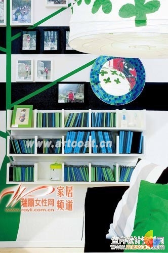 白色的开放式CD架,采用挡板隔出小格,方便CD的收纳。白色墙壁和白色家具显得色彩清冷,可通过放置色彩鲜艳的CD、军绿色靠枕及带有绿叶图案的吊灯来调和色彩。CD架 150元/个 118×17 宜家