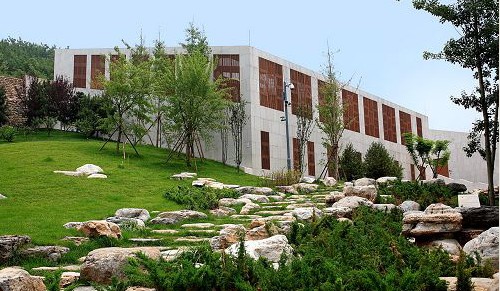 方盒形建筑位于斜坡山体,山体后高前低,自然景观优美且浑然天成