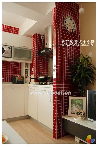 进门第一眼,就看到的红色马赛克,白色的小灯是我特意去选来的,很便宜80元一个,买了2个。有人说进门看见红色很吉利,有人说进门看见表不好,就先这样吧。以后有喜欢的东西把表再换下来吧。