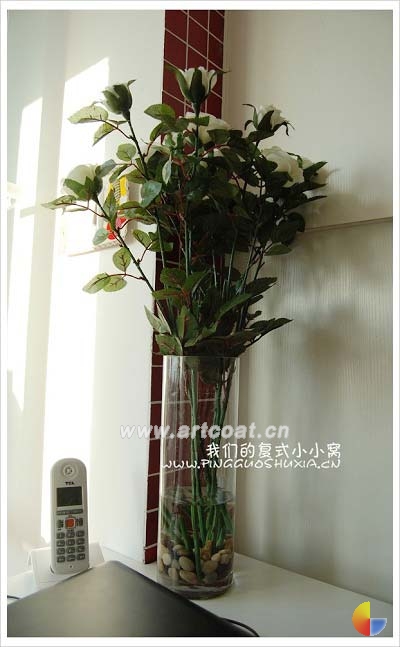 小吧台上的风光,白色玫瑰,买的是假花,真花真的不好伺候呢~TCL的子母电话,主机放在了楼上。