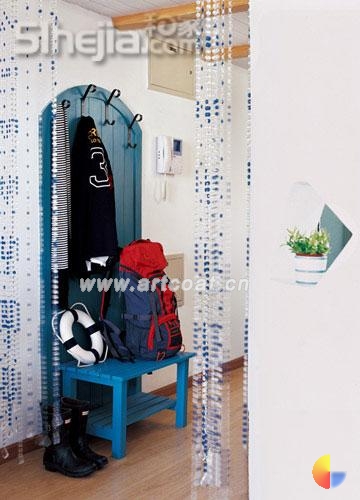 初一看,会觉得整套房子温馨简单;细细一品,方才觉出那些隐藏在简单外表下的用心与精致。不选用批量生产的整体橱柜而是自己砌台、贴面、做装饰线;书柜、衣橱无一不是自行设计定做;白色的铁艺床也要精心锻造出独特的曲线;玄关装饰墙、书房的隔板,都刷上自行调配的蓝;洗手间里的洗手池是喷制得可以乱真的仿砂石台面,沙粒的手感不禁让人想到海边沙滩。