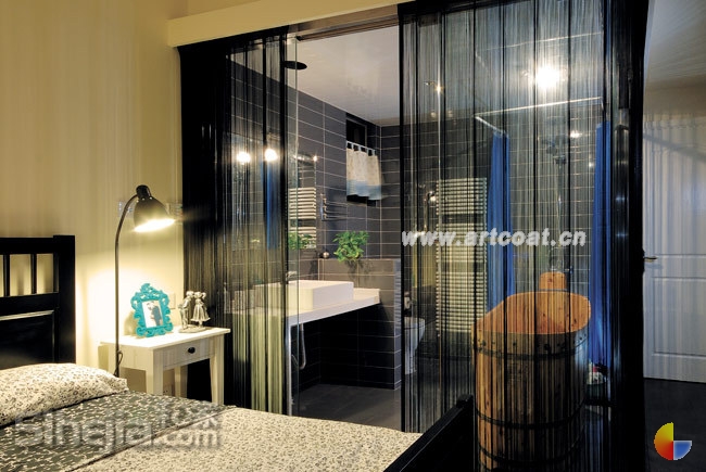 卧室内半开放式的洗浴间可以吸引所有人的眼光,以黑色纱帘半掩住,极具诱惑性。   .