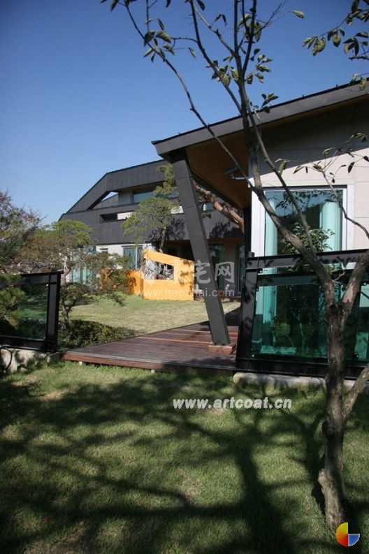 建筑主要分为两大块,一块是主人间,另一块是客房,而客房则代表了这间住宅的主要形象。两大体块中间部分是室外空间,主要通过功能框架和景观元素得以体现。