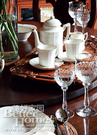 维多利亚风格的瓷器和高脚杯,衬以木雕托盘,别有风味。