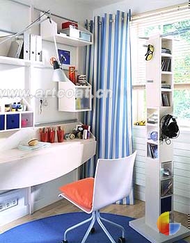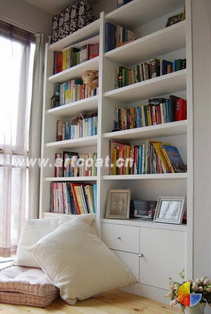 居室面积小,一般都不设有单独的书房或工作间,如果把阳台与居室打通,阳台就可以成为崭新的书房而加以利用了。在靠墙的位置装上层层固定式书架,再放上一张小巧的书桌,一个独立的区域就营造出来了。