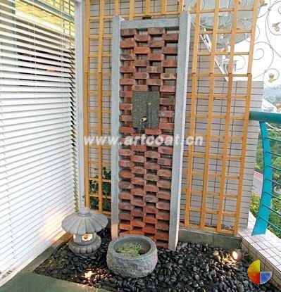 这个阳台面积较大又位于顶楼,应该属于“露台”。设计师在阳台上加了透明的弧形采光顶,使这个阳台可以当作一个房间使用。阳光通过采光板洒向用韩国文化石做的墙壁,以及青石板铺成的地面,而且也照亮了“人”字型的鹅卵石小径……这些园林造景手法,用在这个阳台上,给人浓浓的休闲气息。