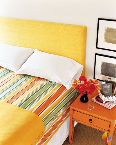 亚麻也不总是和褶皱联系在一起,比如客厅里的这件柠檬黄色沙发套,把沙发的“型”衬托得凹凸有致,亚麻窗帘则选择了黄绿色,与沙发形成和谐的呼应。房间中,从带有民间风味的地毯