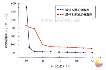 由于导电粒子粒径小、比表面积大、表面自由能高的特点,作为功能填料加入到乳液中,容易发生絮凝,导致涂料贮存稳定性变差和导电能力下降。图 3 分别为加入分散剂(漆样 A )和未加入分散剂(漆样 B )的涂层的电阻率的变化曲线。