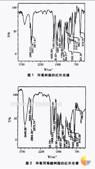 环权树脂与环舰丙烯酸酷的红外光谱 比较环氧树脂与环氧丙烯酸醋预聚物的谱图可看出:图2上1510cm-1,83cm-1,附近的对位取代的苯环吸收峰和1248cm-1,附近的脂肪芳香醚键的吸收峰仍然保留,915cm-1,附近的环氧树脂环氧基特征吸收峰消失,而在1608cm-1,1408cm-1,附近出现了双键特征吸收峰,1725cm,处出现酷基特征吸收峰,证明环氧树脂已基本转化为环氧丙烯酸醋。 2.2权化荆对A组分性能的影响 氧化剂含量对A组分性能的影响如图3,4。