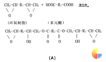 第一步:两个环氧分子中各自的一个环氧基团与一个多元酸中的两个羧基进行加成反应,生成具有如下结构式的预聚物( A ),其分子两端具有环氧基团,多元酸在分子中间起到增韧的作用: