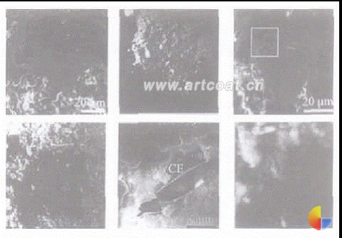 乳胶形成不平整的膜。这种起伏的表面形貌可以通过二次电子 (SE) 成像观察到。形成不平整表面的原因可以通过观察高能背散射电子 (BSE) 像获得,从这些乳胶膜中可以发现许多矿物质包含在内 ( 见图 2) 。 SE/BSE 结合成像技术可以同时反映出形貌的内部微结构。与乳液相比,纤维素醚在孔隙的交界面处形成超薄膜 ( < 1 μ m) 。这些纤弱的结构对二次电子是部分透明的。纤维素醚形成的膜也会含有矿物,但要比乳液膜少得多 ( 见图 3) 。 中国艺术涂料网“转载文章,请注明:文章来源中国艺术涂料网”
