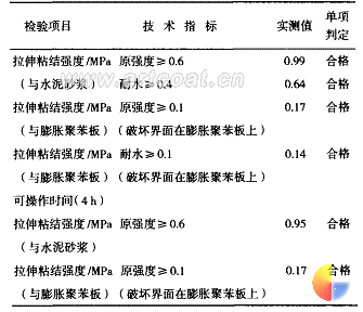 聚合物乳液与水泥以 1 : 2 的比例配制后,制得的外墙外保温系统专用粘结剂送往上海市建筑 材料及构件质量监督检测站检验,按照膨胀聚苯板 薄抹灰外墙外保温系统 (JG 149--2003) 标准规定对其性能进行测试,结果如表 8 所示。