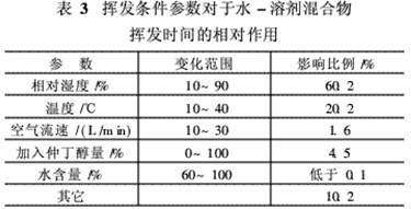 4)水的挥发速率与环境的相对湿度(RH)和温度以及基层的温度关系很大。25℃,RH=0~5%时,水在滤纸上的相对蒸发速率是0.31,当RH=100%,水的相对蒸发速率成为0。温度越高,水的挥发速率愈快。