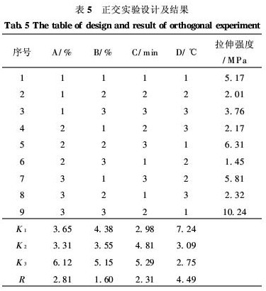 通过正交实验,以涂膜的拉伸强度为依据,确定环氧树脂和增塑剂的用量及反应时间、反应温度。因素水平表见表4,正交实验设计及结果见表5。通过分析极差,4种因素对涂膜平均拉伸强度影响的主次顺序依次为D,A,C,B,而最佳工艺参数为A3B3C3D1,即环氧树脂的质量分数为7%,增塑剂的质量分数为5%,反应时间为50min,反应温度为60℃。