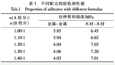 不同配比对PU胶粘剂力学性能的影响如表1所示。由表1可知:当n(A组分)∶n(B组分)=1.30∶1时,胶粘剂的粘接效果最佳。