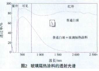 玻璃隔热涂料在可见光区具有高的透过性,而在近红外光区具有高的反射率和吸收率,能够在不明显降低室内采光的情况下实现良好的隔热。由于玻璃隔热涂料会吸收一部分太阳辐射,涂刷玻璃隔热涂料后,玻璃表面温度会升高,这是在实际应用中需注意的问题。玻璃隔热涂料的透射光谱如图2所示。