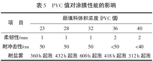 从表5可见,随着PVC值的增大,涂膜的耐盐雾性逐渐降低,而锈蚀性却逐渐增大,且柔韧性、耐冲击性均逐渐降低。这是因为在正常情况下,涂层中聚合物树脂基料的数量可足以包覆涂层中的颜填料颗粒,此时涂层为连续致密的膜,而当涂膜中的颜填料体积浓度大于某一定值(临界体积浓度)而使树脂基料不足以包覆这些颜填料颗粒时,涂膜的各项性质均会发生突变。本项目涂料体系的最佳PVC值为32%。