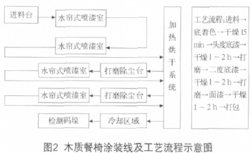 餐椅涂装常用木材为榉木、柞木、水曲柳、枫木等实木,涂装效果以开放式和半开放式为主。又可以分清漆和实色漆,清漆可以做本色(不做任何颜色效果)涂装效果,也可以做透明色涂装效果,透明色效果一般采用底着色工艺上色;实色一般黑色和白色偏多。工艺一般都采用两底一面或两底两面,每遍喷涂1~2枪,每遍涂膜喷涂后先在常温下干燥10min左右,涂膜表干后进入烘烤系统进行强制烘干(一般温度控制在30~40℃)1h左右,出来冷却10min后打磨除尘,然后进入下一道工序。经过涂装后的木质餐椅涂膜手感光滑细腻,清漆透明度好、木纹清晰、色彩自然,实色漆遮盖力强,不掉色,色彩或温或鲜艳。图2为大多数餐椅生产厂家采用的流水盘线以及典型涂装工艺流程。