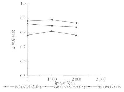 从表1中可以看出,JC/T1040)2007对涂层的耐老化性要求过低,溶剂型涂料也只有500h;JG/T235)2008要求各类涂料满足相应树脂基体涂料的耐老化要求,未对热反射衰减提出要求,同时采用的耐沾污试验方法为GB/T9780)2005,该方法主要适用于外墙涂料,对金属涂料并不适用。大多数金属装饰涂层都可轻松地通过标准的要求,但现实中金属涂层表面严重积垢的现象比比皆是。对A、B、C(B、C为不同类型的氟碳涂料)3种树脂基体的白色热反射屋面板材料进行测试,分别进行1000h、2000h人工气候老化。耐沾污按GB/T9780)2005和ASTMD3719进行。ASTM为将样板在户外朝南45b放置61d,然后不经清洗直接进行测量。考虑热反射涂料发挥作用主要在夏季,因此本实验样品户外放置时间为2009年6月1日)2009年7月31日。